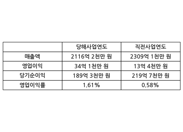 이번사업연도의 매출액은 직전사업연도 대비 -8.35% 감소한 2116억 2천만 원, 영업이익은 34억 1천만 원, 당기순이익은 189억 3천만 원이라고 공시했다.