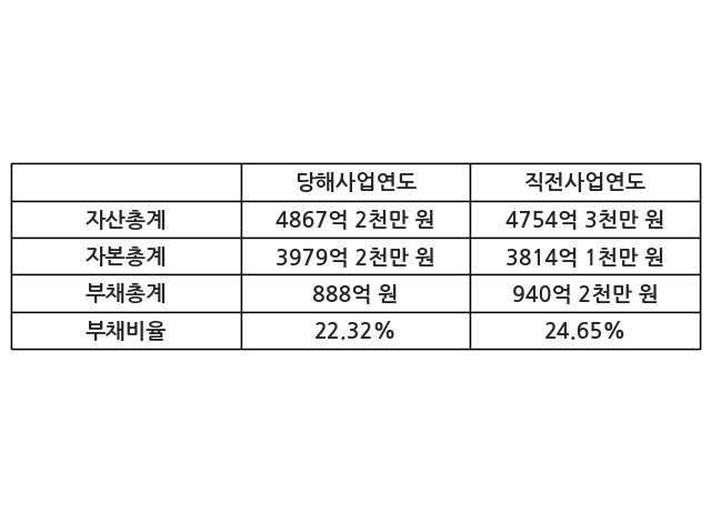 또한, 이번사업연도의 자산총계는 4867억 2천만 원으로 직전사업연도 대비 2.37% 증가한 한편, 부채총계는 888억 원으로 -5.55% 감소, 자본총계는 3979억 2천만 원으로 4.33% 증가했다.