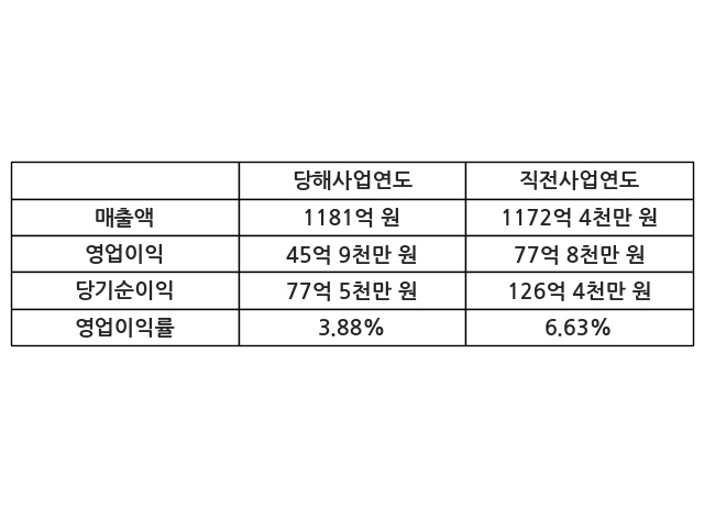 이번사업연도의 매출액은 직전사업연도 대비 0.73% 증가한 1181억 원, 영업이익은 45억 9천만 원, 당기순이익은 77억 5천만 원이라고 공시했다.