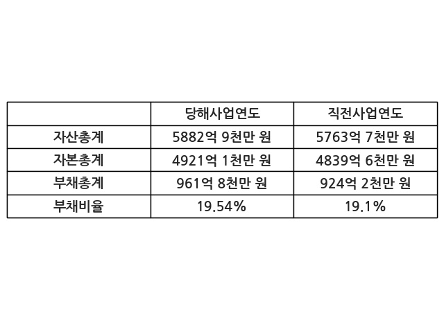 또한, 이번사업연도의 자산총계는 5882억 9천만 원으로 직전사업연도 대비 2.07% 증가한 한편, 부채총계는 961억 8천만 원으로 4.07% 증가, 자본총계는 4921억 1천만 원으로 1.68% 증가했다.