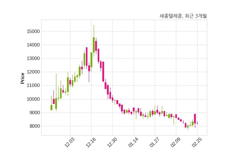 한편, 세종텔레콤은 장 마감 이후 해당 기업공시를 발표했으며 오늘 종가가 8,190원, 거래량은 20,281주로, 직전 거래일 대비 30원(-0.36%) 하락했다.