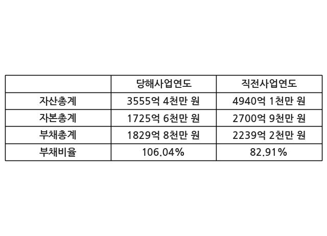 또한, 이번사업연도의 자산총계는 3555억 4천만 원으로 직전사업연도 대비 -28.03% 감소한 한편, 부채총계는 1829억 8천만 원으로 -18.29% 감소, 자본총계는 1725억 6천만 원으로 -36.11% 감소했다.