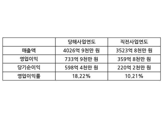이번사업연도의 매출액은 직전사업연도 대비 14.28% 증가한 4026억 9천만 원, 영업이익은 733억 9천만 원, 당기순이익은 598억 4천만 원이라고 공시했다.