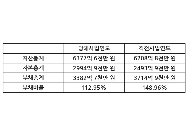 또한, 이번사업연도의 자산총계는 6377억 6천만 원으로 직전사업연도 대비 2.72% 증가한 한편, 부채총계는 3382억 7천만 원으로 -8.94% 감소, 자본총계는 2994억 9천만 원으로 20.09% 증가했다.