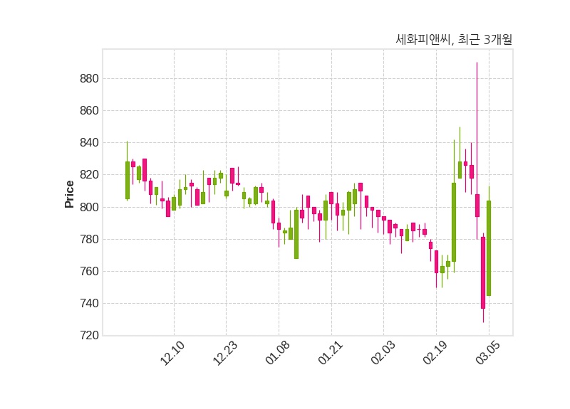 한편, 세화피앤씨의 14시 34분 현재주가는 804원으로 직전 거래일 대비 67원(+9.09%) 상승이며, 거래량은 276,414주이다.