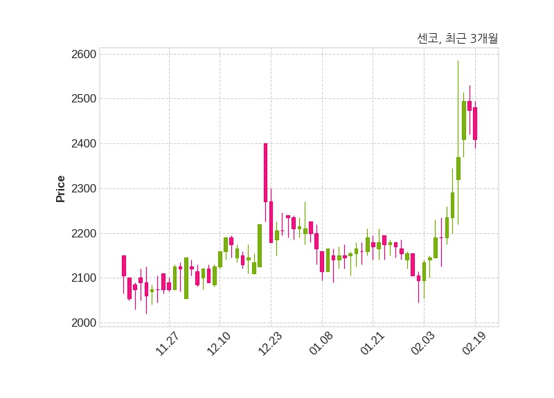 한편, 센코는 장 마감 이후 해당 기업공시를 발표했으며 오늘 종가가 2,410원, 거래량은 416,922주로, 직전 거래일 대비 65원(-2.63%) 하락했다.