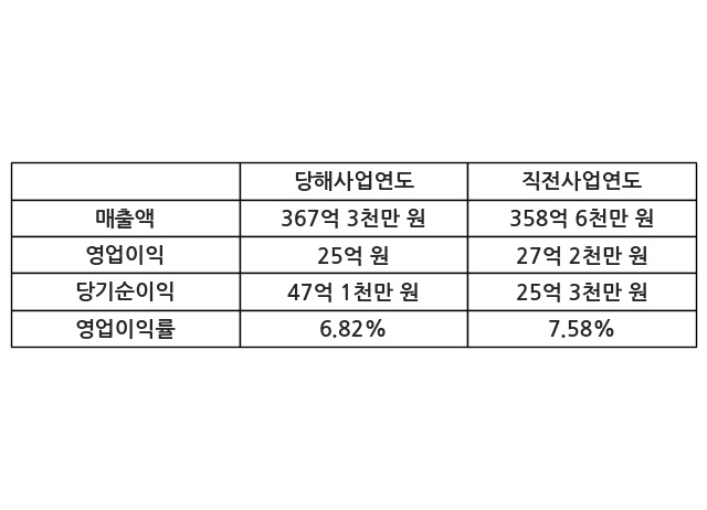 이번사업연도의 매출액은 직전사업연도 대비 2.41% 증가한 367억 3천만 원, 영업이익은 25억 원, 당기순이익은 47억 1천만 원이라고 공시했다.