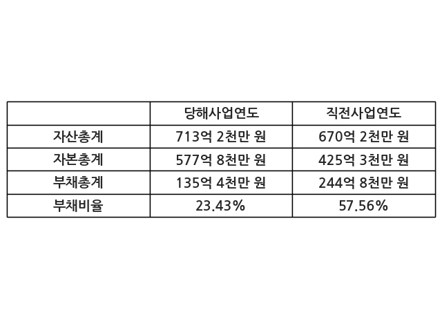 또한, 이번사업연도의 자산총계는 713억 2천만 원으로 직전사업연도 대비 6.43% 증가한 한편, 부채총계는 135억 4천만 원으로 -44.69% 감소, 자본총계는 577억 8천만 원으로 35.85% 증가했다.