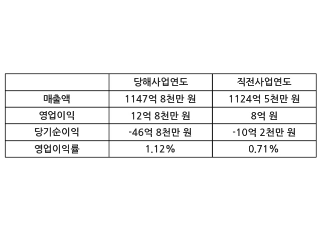 이번사업연도의 매출액은 직전사업연도 대비 2.07% 증가한 1147억 8천만 원, 영업이익은 12억 8천만 원, 당기순이익은 -46억 8천만 원이라고 공시했다.