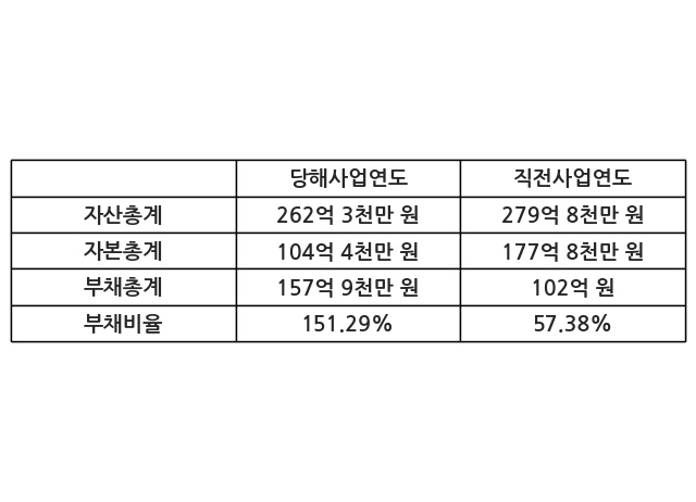 또한, 이번사업연도의 자산총계는 262억 3천만 원으로 직전사업연도 대비 -6.27% 감소한 한편, 부채총계는 157억 9천만 원으로 54.78% 증가, 자본총계는 104억 4천만 원으로 -41.3% 감소했다.