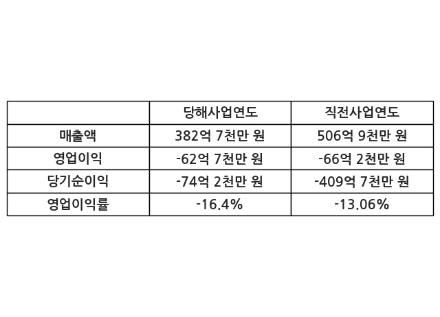 이번사업연도의 매출액은 직전사업연도 대비 -24.5% 감소한 382억 7천만 원, 영업이익은 -62억 7천만 원, 당기순이익은 -74억 2천만 원이라고 공시했다.