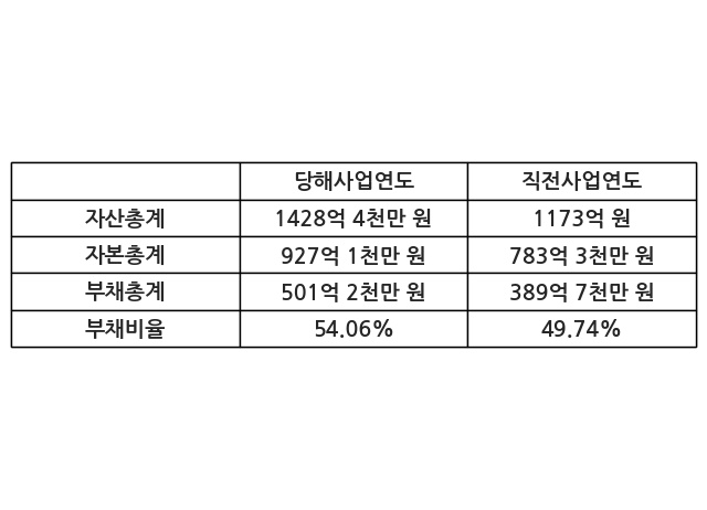 또한, 이번사업연도의 자산총계는 1428억 4천만 원으로 직전사업연도 대비 21.77% 증가한 한편, 부채총계는 501억 2천만 원으로 28.63% 증가, 자본총계는 927억 1천만 원으로 18.36% 증가했다.