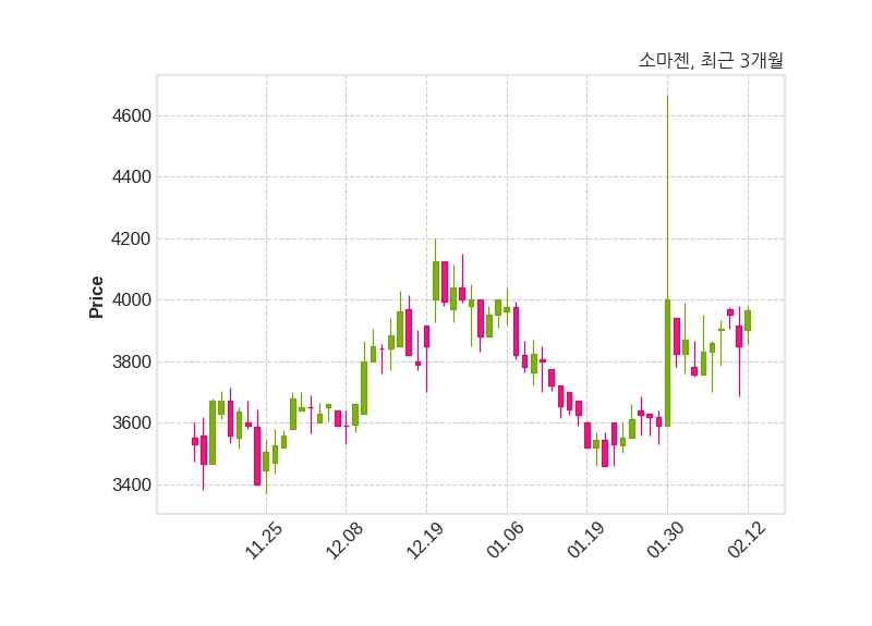 한편, 소마젠의 15시 00분 현재주가는 3,965원으로 직전 거래일 대비 115원(+2.99%) 상승이며, 거래량은 52,734주이다.