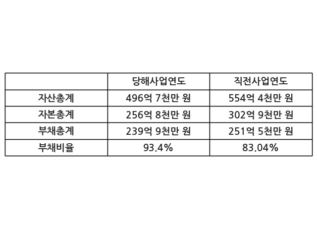 또한, 이번사업연도의 자산총계는 496억 7천만 원으로 직전사업연도 대비 -10.4% 감소한 한편, 부채총계는 239억 9천만 원으로 -4.61% 감소, 자본총계는 256억 8천만 원으로 -15.2% 감소했다.