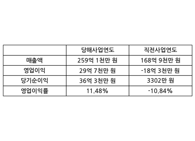이번사업연도의 매출액은 직전사업연도 대비 53.41% 증가한 259억 1천만 원, 영업이익은 29억 7천만 원, 당기순이익은 36억 3천만 원이라고 공시했다.