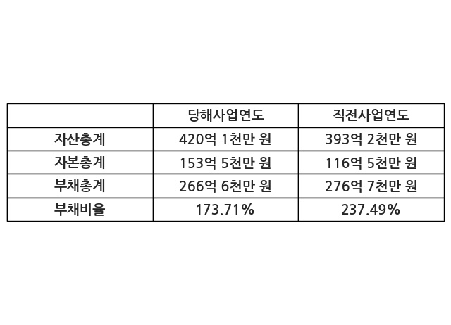 또한, 이번사업연도의 자산총계는 420억 1천만 원으로 직전사업연도 대비 6.85% 증가한 한편, 부채총계는 266억 6천만 원으로 -3.63% 감소, 자본총계는 153억 5천만 원으로 31.75% 증가했다.