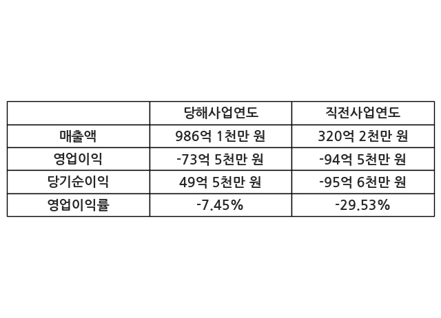 이번사업연도의 매출액은 직전사업연도 대비 207.95% 증가한 986억 1천만 원, 영업이익은 -73억 5천만 원, 당기순이익은 49억 5천만 원이라고 공시했다.
