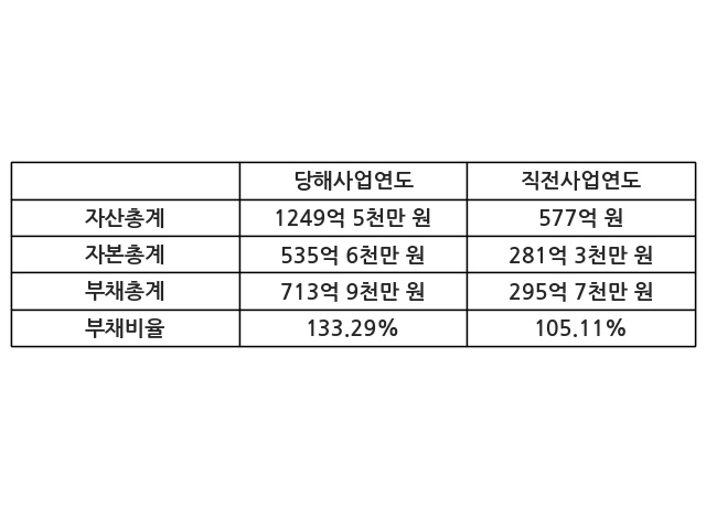 또한, 이번사업연도의 자산총계는 1249억 5천만 원으로 직전사업연도 대비 116.53% 증가한 한편, 부채총계는 713억 9천만 원으로 141.41% 증가, 자본총계는 535억 6천만 원으로 90.38% 증가했다.