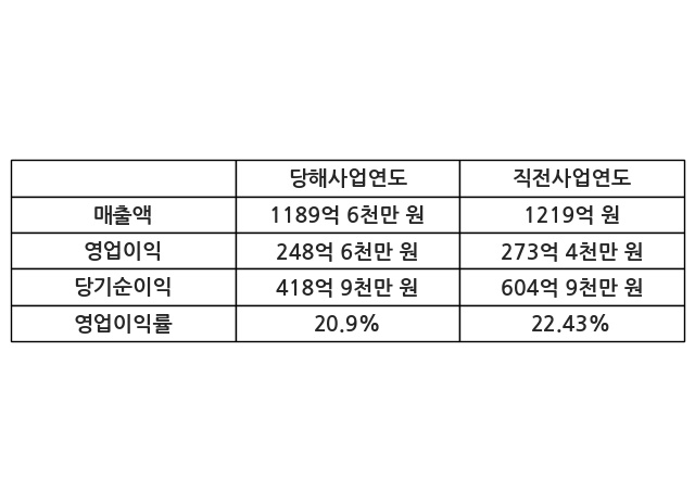이번사업연도의 매출액은 직전사업연도 대비 -2.42% 감소한 1189억 6천만 원, 영업이익은 248억 6천만 원, 당기순이익은 418억 9천만 원이라고 공시했다.