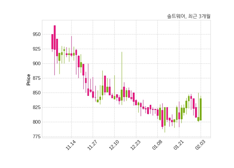 한편, 솔트웨어는 장 마감 이후 해당 기업공시를 발표했으며 오늘 종가가 840원, 거래량은 54,499주로, 직전 거래일 대비 32원(+3.96%) 상승했다.