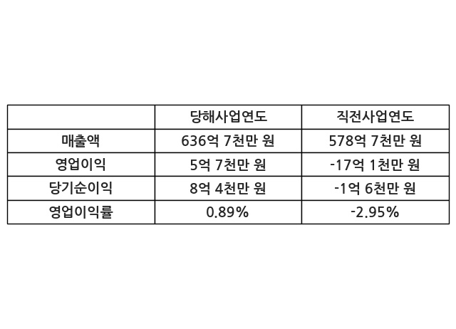 이번사업연도의 매출액은 직전사업연도 대비 10.03% 증가한 636억 7천만 원, 영업이익은 5억 7천만 원, 당기순이익은 8억 4천만 원이라고 공시했다.