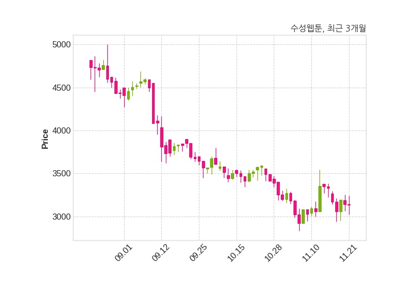 담보설정금액은 150억 2천만 원으로한편, 수성웹툰은 장 마감 이후 해당 기업공시를 발표했으며 오늘 종가가 3,135원, 거래량은 30,949주로, 직전 거래일 대비 5원(-0.16%) 하락했다.