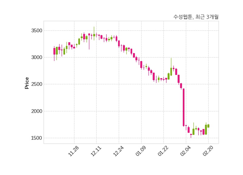 수성웹툰은 특별관계자 투믹스홀딩스의 지분율이 53.28%에서 53.83%로 변동했다고 20일 공시했다. 한편, 수성웹툰의 10시 04분 현재주가는 1,748원으로 직전 거래일 대비 3원(+0.17%) 상승이며, 거래량은 176,018주이다.