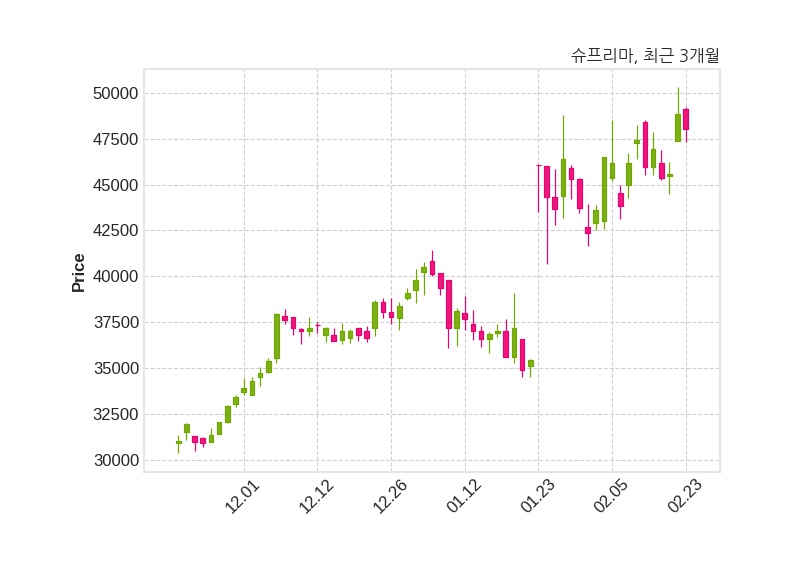 한편, 슈프리마는 장 마감 이후 해당 기업공시를 발표했으며 오늘 종가가 48,050원, 거래량은 67,888주로, 직전 거래일 대비 800원(-1.64%) 하락했다.