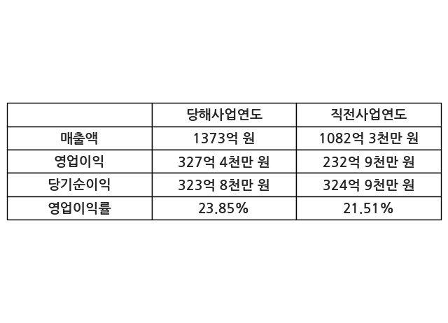 이번사업연도의 매출액은 직전사업연도 대비 26.86% 증가한 1373억 원, 영업이익은 327억 4천만 원, 당기순이익은 323억 8천만 원이라고 공시했다.
