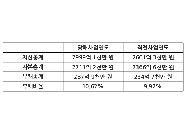 또한, 이번사업연도의 자산총계는 2999억 1천만 원으로 직전사업연도 대비 15.29% 증가한 한편, 부채총계는 287억 9천만 원으로 22.66% 증가, 자본총계는 2711억 2천만 원으로 14.56% 증가했다.