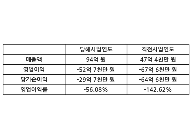 이번사업연도의 매출액은 직전사업연도 대비 98.39% 증가한 94억 원, 영업이익은 -52억 7천만 원, 당기순이익은 -29억 7천만 원이라고 공시했다.