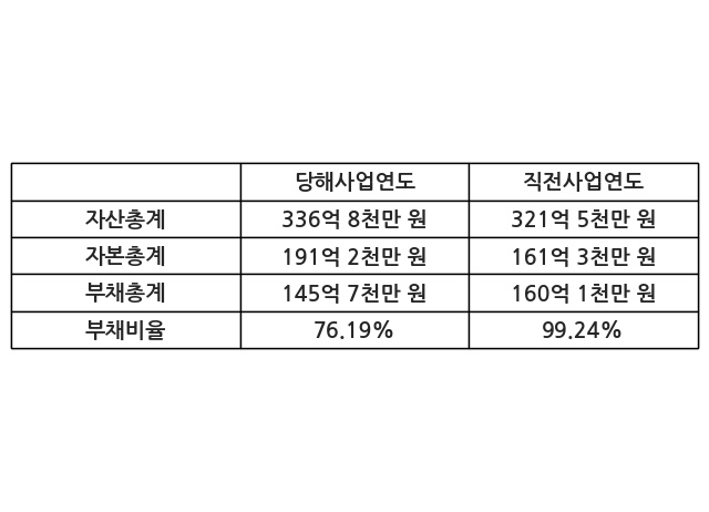 또한, 이번사업연도의 자산총계는 336억 8천만 원으로 직전사업연도 대비 4.78% 증가한 한편, 부채총계는 145억 7천만 원으로 -9.03% 감소, 자본총계는 191억 2천만 원으로 18.48% 증가했다.