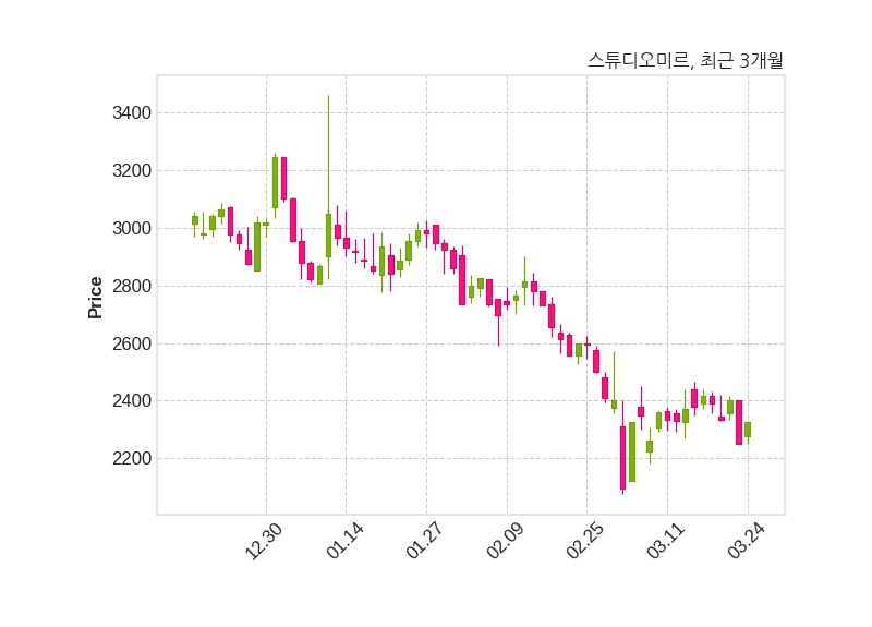 스튜디오미르는 특별관계자 유재명의 지분율이 65.6%에서 65.46%로 변동했다고 24일 공시했다. 한편, 스튜디오미르는 장 마감 이후 해당 기업공시를 발표했으며 오늘 종가가 2,325원, 거래량은 75,290주로, 직전 거래일 대비 75원(+3.33%) 상승했다.