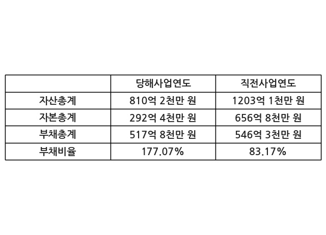 또한, 이번사업연도의 자산총계는 810억 2천만 원으로 직전사업연도 대비 -32.66% 감소한 한편, 부채총계는 517억 8천만 원으로 -5.22% 감소, 자본총계는 292억 4천만 원으로 -55.48% 감소했다.