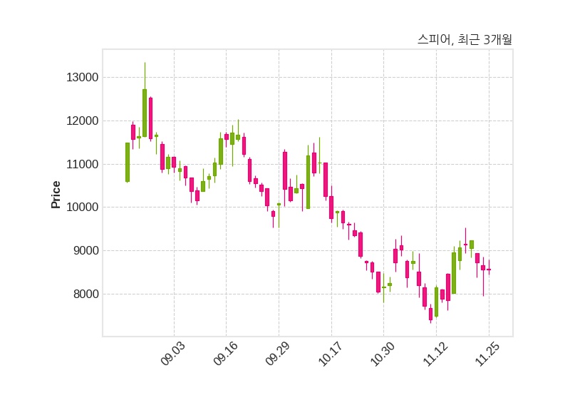 한편, 스피어는 장 마감 이후 해당 기업공시를 발표했으며 오늘 종가가 8,560원, 거래량은 79,334주로, 직전 거래일 대비 10원(+0.12%) 상승했다.
