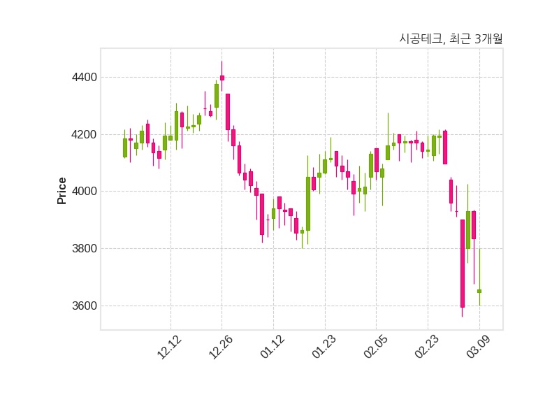 한편, 시공테크는 장 마감 이후 해당 기업공시를 발표했으며 오늘 종가가 3,655원, 거래량은 135,706주로, 직전 거래일 대비 180원(-4.69%) 하락했다.