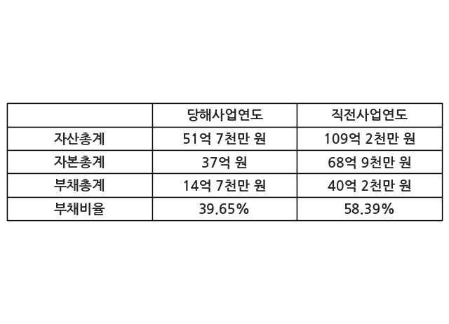 또한, 이번사업연도의 자산총계는 51억 7천만 원으로 직전사업연도 대비 -52.6% 감소한 한편, 부채총계는 14억 7천만 원으로 -63.49% 감소, 자본총계는 37억 원으로 -46.24% 감소했다.