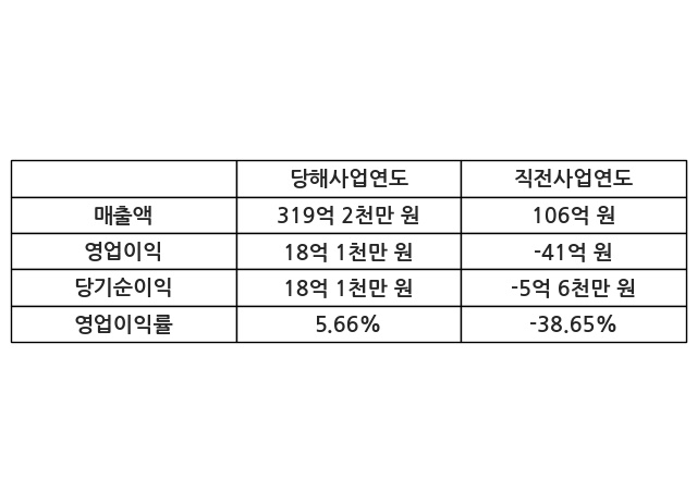 이번사업연도의 매출액은 직전사업연도 대비 201.23% 증가한 319억 2천만 원, 영업이익은 18억 1천만 원, 당기순이익은 18억 1천만 원이라고 공시했다.