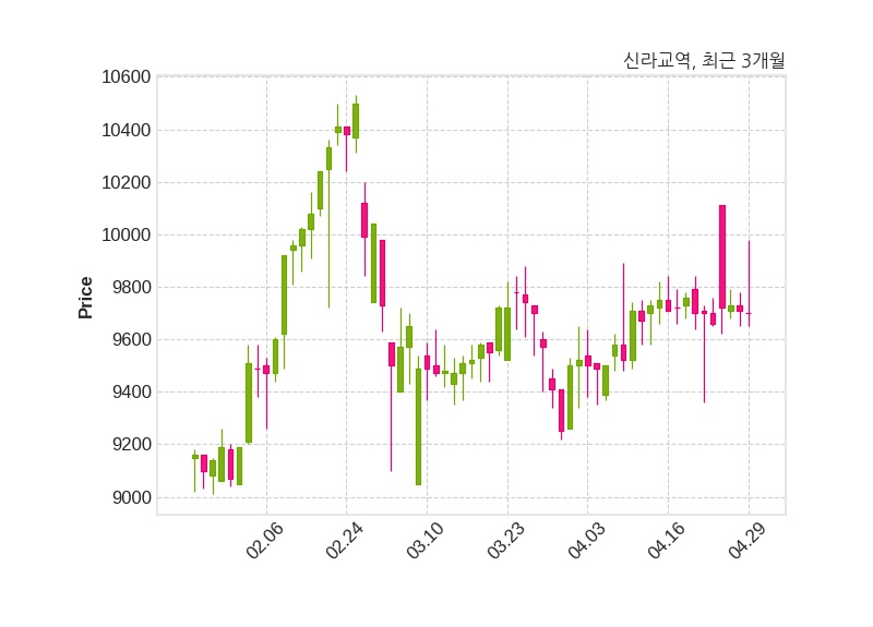 한편, 신라교역은 장 마감 이후 해당 기업공시를 발표했으며 오늘 종가가 9,700원, 거래량은 10,404주로, 직전 거래일 대비 10원(-0.1%) 하락했다.