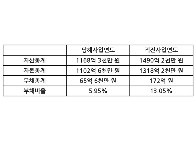 또한, 이번사업연도의 자산총계는 1168억 3천만 원으로 직전사업연도 대비 -21.6% 감소한 한편, 부채총계는 65억 6천만 원으로 -61.86% 감소, 자본총계는 1102억 6천만 원으로 -16.35% 감소했다.