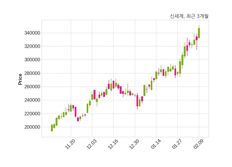 한편, 신세계의 13시 53분 현재주가는 347,000원으로 직전 거래일 대비 17,500원(+5.31%) 상승이며, 거래량은 75,648주이다.