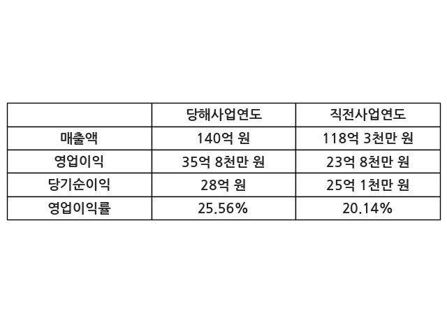 이번사업연도의 매출액은 직전사업연도 대비 18.36% 증가한 140억 원, 영업이익은 35억 8천만 원, 당기순이익은 28억 원이라고 공시했다.