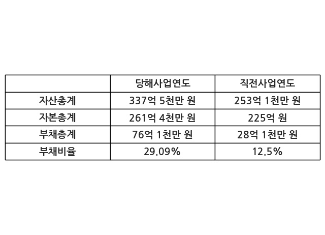 또한, 이번사업연도의 자산총계는 337억 5천만 원으로 직전사업연도 대비 33.36% 증가한 한편, 부채총계는 76억 1천만 원으로 170.57% 증가, 자본총계는 261억 4천만 원으로 16.22% 증가했다.