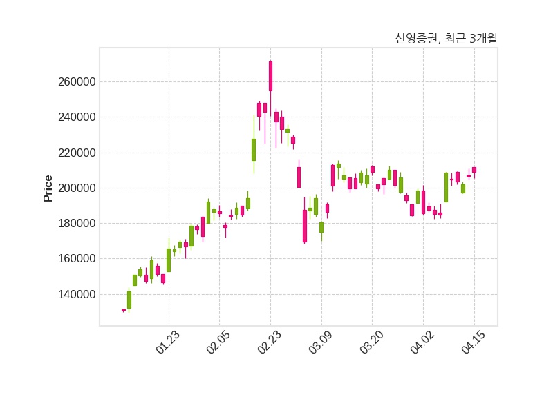 한편, 신영증권은 장 마감 이후 해당 기업공시를 발표했으며 오늘 종가가 209,000원, 거래량은 14,932주로, 직전 거래일 대비 2,500원(+1.21%) 상승했다.