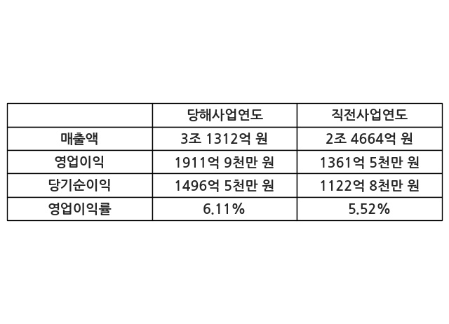 이번사업연도의 매출액은 직전사업연도 대비 26.96% 증가한 3조 1312억 원, 영업이익은 1911억 9천만 원, 당기순이익은 1496억 5천만 원이라고 공시했다.