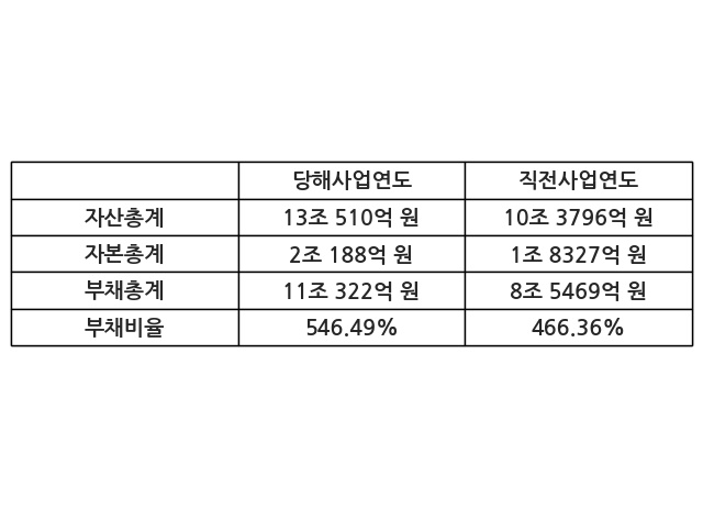 또한, 이번사업연도의 자산총계는 13조 510억 원으로 직전사업연도 대비 25.74% 증가한 한편, 부채총계는 11조 322억 원으로 29.08% 증가, 자본총계는 2조 188억 원으로 10.15% 증가했다.