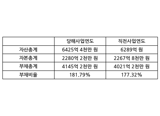 또한, 이번사업연도의 자산총계는 6425억 4천만 원으로 직전사업연도 대비 2.17% 증가한 한편, 부채총계는 4145억 2천만 원으로 3.08% 증가, 자본총계는 2280억 2천만 원으로 0.55% 증가했다.