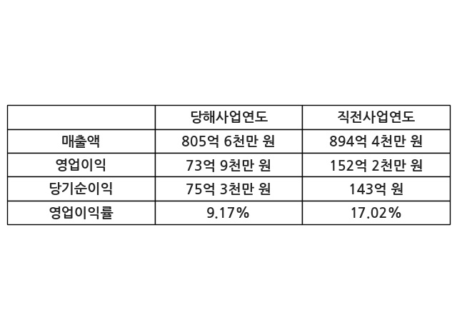 이번사업연도의 매출액은 직전사업연도 대비 -9.92% 감소한 805억 6천만 원, 영업이익은 73억 9천만 원, 당기순이익은 75억 3천만 원이라고 공시했다.