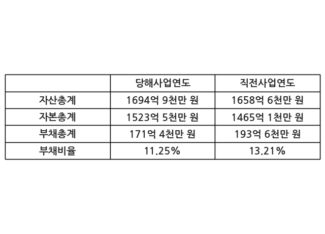 또한, 이번사업연도의 자산총계는 1694억 9천만 원으로 직전사업연도 대비 2.19% 증가한 한편, 부채총계는 171억 4천만 원으로 -11.45% 감소, 자본총계는 1523억 5천만 원으로 3.99% 증가했다.
