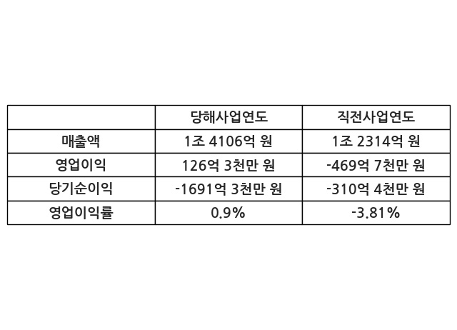 이번사업연도의 매출액은 직전사업연도 대비 14.55% 증가한 1조 4106억 원, 영업이익은 126억 3천만 원, 당기순이익은 -1691억 3천만 원이라고 공시했다.